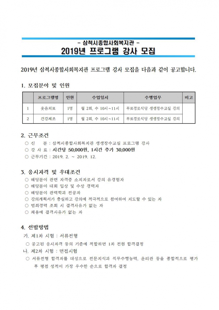 모집공고 2019년 생생장수교실 강사 모집 공고
