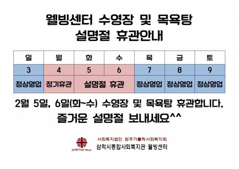 공지사항 웰빙센터 설연휴 휴장안내 페이지 정보 작성자 김해나 댓글 0건 조회 5,447회 작성일 19-01-31 12:57 목록 게시판 리스트 옵션 검색 본문 페이스북 공유 트위터 공유 이전글행복카페 담쟁이 영업시간 변경 안내(2019년 02년 11일부터 시행) 19.02.13 다음글웰빙센터 직원채용 면접 일정 알림 19.01.21 댓글 0 댓글목록 등록된 댓글이 없습니다.