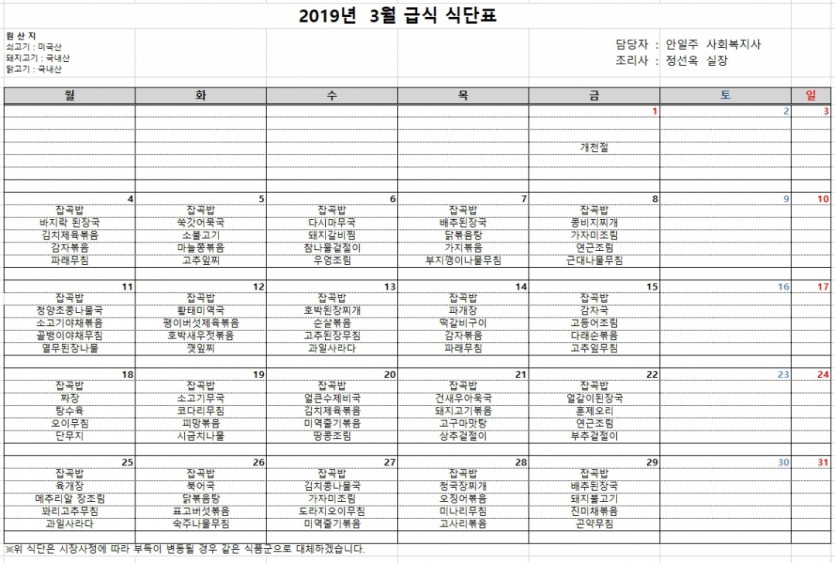 식단표 2019년 3월 식단표 페이지 정보 작성자 안일주 댓글 0건 조회 5,415회 작성일 19-03-04 16:10 목록 게시판 리스트 옵션 검색 본문 페이스북 공유 트위터 공유 2019년 3월 식단표입니다. 문의 : 573-6168( 담당 안일주 사회복지사 ) 이전글2019년 4월 식단표 19.04.03 다음글2019년 2월 식단표 19.02.01 댓글 0 댓글목록 등록된 댓글이 없습니다.