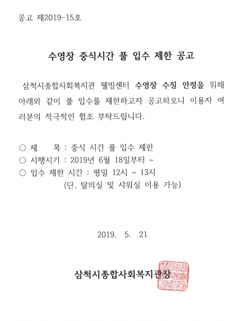 공지사항 수영장 중식시간 풀 입수 제한 공고 페이지 정보 작성자 Michael 댓글 0건 조회 5,803회 작성일 19-05-21 12:58 목록 게시판 리스트 옵션 검색 본문 페이스북 공유 트위터 공유 이전글영상정보기기 운영 관리 방침 안내 19.05.21 다음글복지관 차량운행시간표 20.06.13 댓글 0 댓글목록 등록된 댓글이 없습니다.