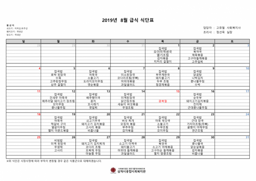 식단표 8월 식단표 페이지 정보 작성자 고유철 댓글 0건 조회 5,310회 작성일 19-07-29 14:22 목록 게시판 리스트 옵션 검색 본문 페이스북 공유 트위터 공유 * 담당자 고유철 033-573-6168 이전글9월 식단표 19.08.29 다음글7월 식단표 19.06.27 댓글 0 댓글목록 등록된 댓글이 없습니다.