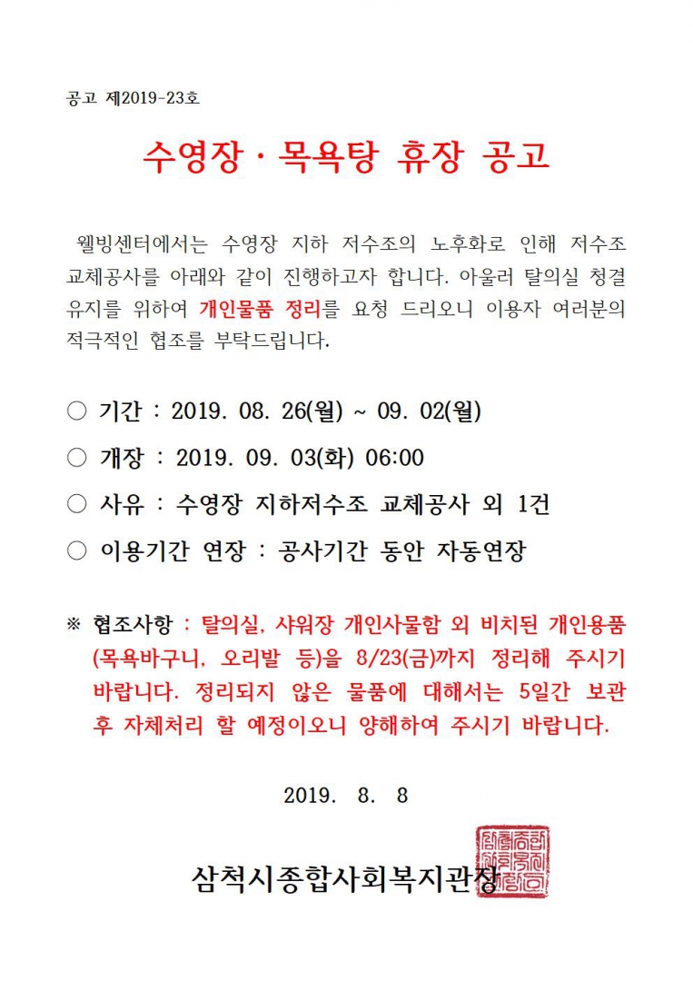 공지사항 수영장, 목욕탕 휴장 공고 페이지 정보 작성자 심성규 댓글 0건 조회 5,449회 작성일 19-08-19 11:00 목록 게시판 리스트 옵션 검색 본문 페이스북 공유 트위터 공유 이전글수영장・목욕탕 휴장기간 연장 재공고 19.08.29 다음글영상정보기기 운영 관리 방침 안내 19.05.21 댓글 0 댓글목록 등록된 댓글이 없습니다.