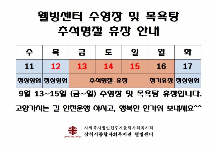 공지사항 웰빙센터 추석연휴 휴장안내 페이지 정보 작성자 심성규 댓글 0건 조회 5,574회 작성일 19-09-06 10:51 목록 게시판 리스트 옵션 검색 본문 페이스북 공유 트위터 공유 이전글수영장 휴장공고 19.10.07 다음글나눔바자회 "함께하여 주심에 깊은 감사를 드립니다." 19.11.11 댓글 0 댓글목록 등록된 댓글이 없습니다.