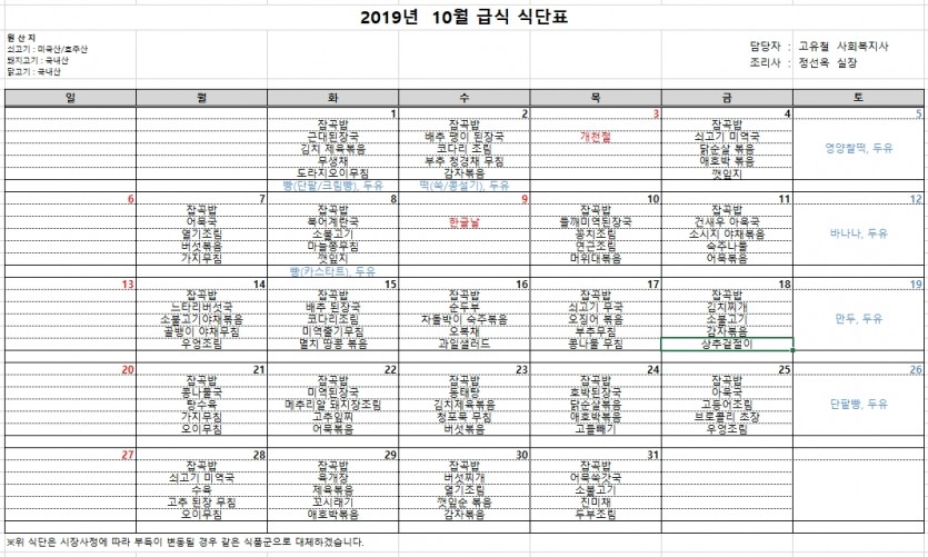 식단표 2019년 10월 식단표 페이지 정보 작성자 안일주 댓글 0건 조회 5,549회 작성일 19-09-30 11:24 목록 게시판 리스트 옵션 검색 본문 페이스북 공유 트위터 공유 * 담당: 고유철 사회복지사( 573-6168 ) 이전글2019년 11월 식단표 19.11.01 다음글9월 식단표 19.08.29 댓글 0 댓글목록 등록된 댓글이 없습니다.