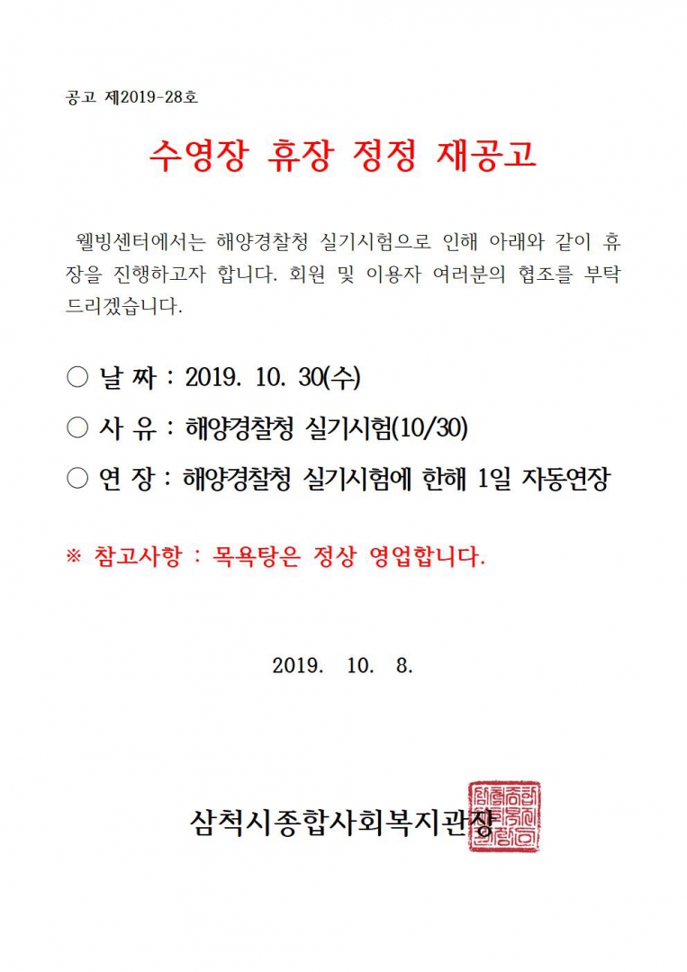 공지사항 수영장 휴장 정정 재공고 페이지 정보 작성자 심성규 댓글 0건 조회 5,752회 작성일 19-10-08 17:30 목록 게시판 리스트 옵션 검색 본문 페이스북 공유 트위터 공유 2019.10.26(토) 진행예정이었던 생체도시배 수영대회는 태풍 피해복구를 위해 취소됨을 알려드리며 수영장은 정상영업합니다. 감사합니다. 이전글후원자 기부금영수증 발급안내 20.05.21 다음글수영장 휴장공고 19.10.07 댓글 0 댓글목록 등록된 댓글이 없습니다.