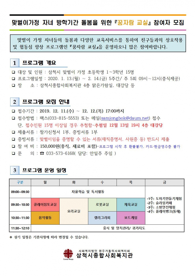 모집공고 2020년 겨울방학 맞벌이가정 자녀 돌봄을 위한 꿈자람교실 참여자 모집(마감)