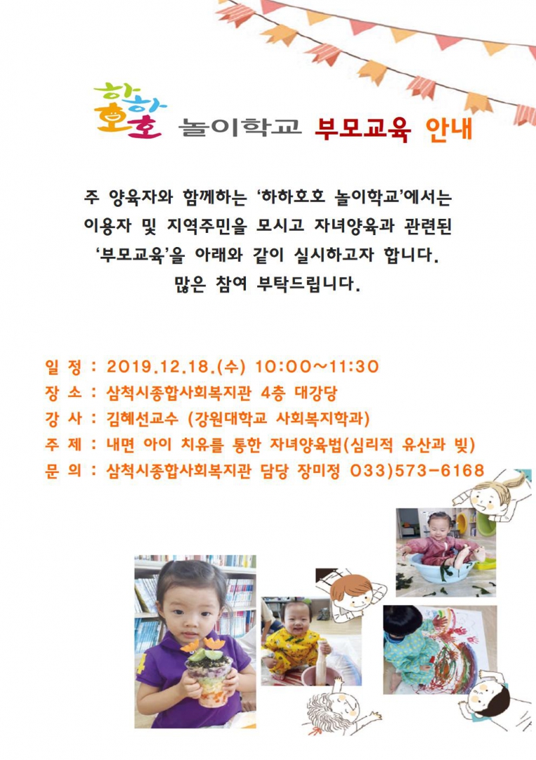 모집공고 하하호호 놀이학교 주 양육자 및 지역주민을 위한 부모교육 특강실시 페이지 정보 작성자 채윤아 댓글 0건 조회 6,041회 작성일 19-12-16 17:28 목록 게시판 리스트 옵션 검색 본문 페이스북 공유 트위터 공유 이전글삼척시종합사회복지관 웰빙센터 수영장 겨울방학 어린이반 모집 19.12.23 다음글2020년 체력증진교실(겨울방학 특강) 참여자 모집(마감) 19.12.19 댓글 0 댓글목록 등록된 댓글이 없습니다.