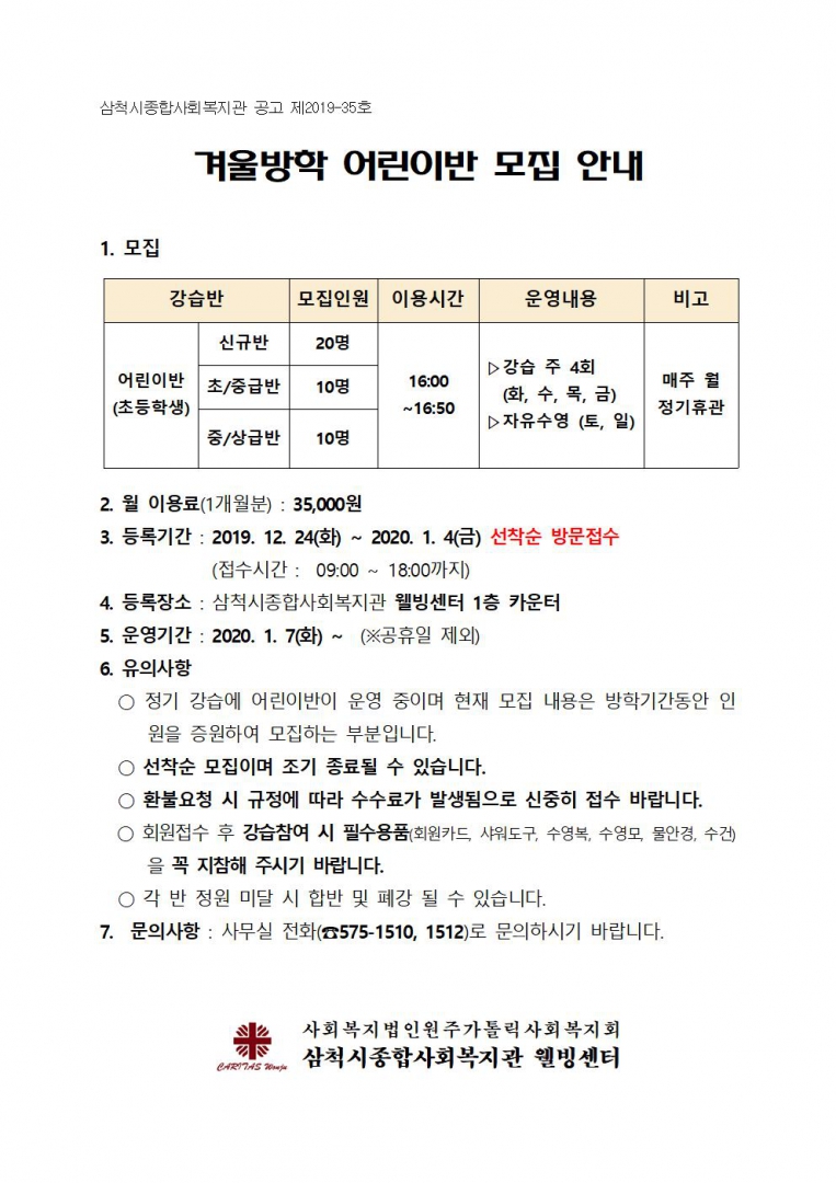 모집공고 삼척시종합사회복지관 웰빙센터 수영장 겨울방학 어린이반 모집 페이지 정보 작성자 심성규 댓글 0건 조회 6,345회 작성일 19-12-23 11:27 목록 게시판 리스트 옵션 검색 본문 페이스북 공유 트위터 공유 이전글2019년 삼척시 종합사회복지관(웰빙센터,푸드뱅크) 2차 추가경정예산안 공고 22.07.20 다음글하하호호 놀이학교 주 양육자 및 지역주민을 위한 부모교육 특강실시 19.12.16 댓글 0 댓글목록 등록된 댓글이 없습니다.