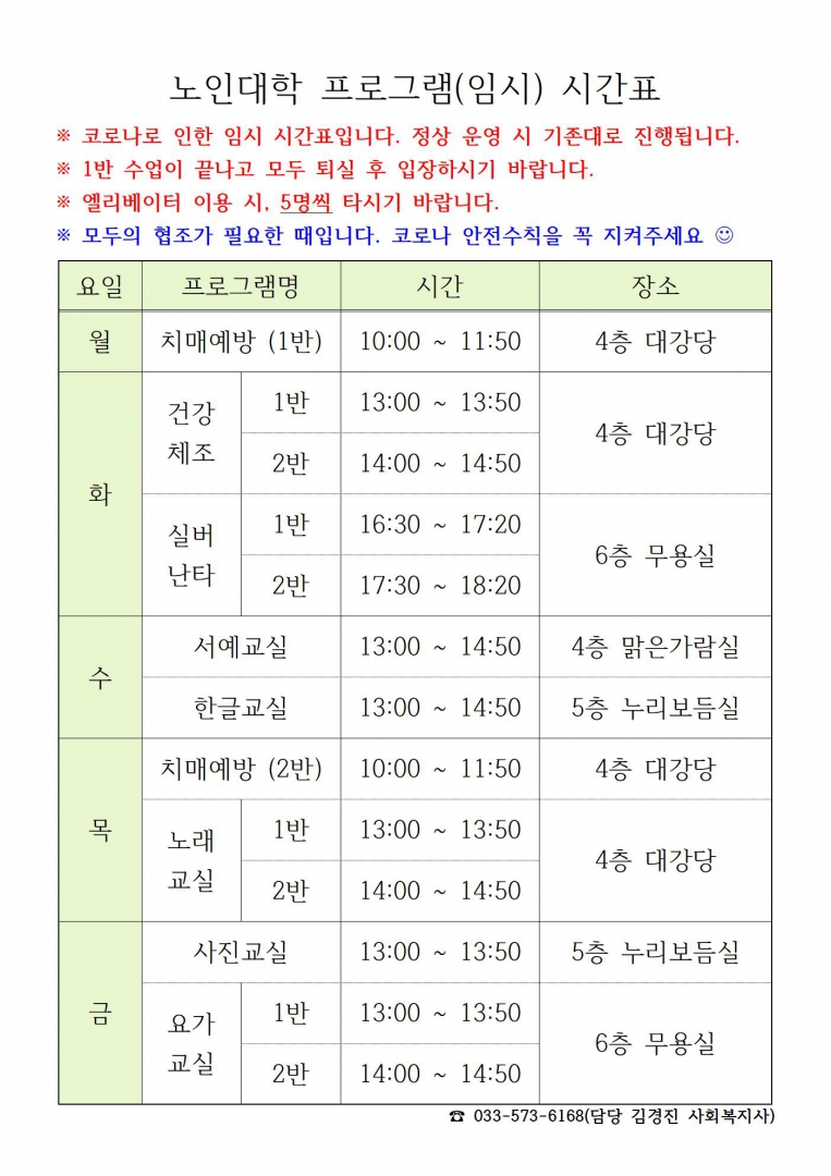 공지사항 2020년 늘푸른노인대학 및 교육문화사업 임시 프로그램 개강 안내