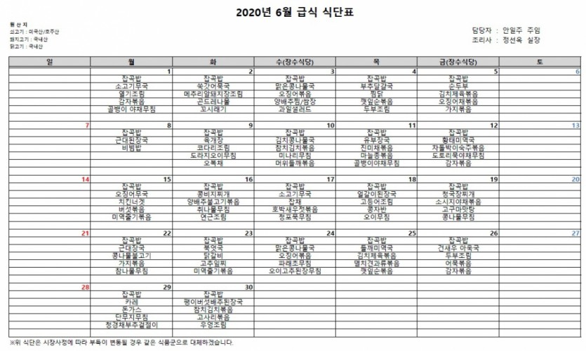 식단표 6월 식단표 페이지 정보 작성자 안일주 댓글 0건 조회 5,532회 작성일 20-06-12 10:42 목록 게시판 리스트 옵션 검색 본문 페이스북 공유 트위터 공유 이전글7월 식단표 20.06.30 다음글5월 식단표 20.04.28 댓글 0 댓글목록 등록된 댓글이 없습니다.