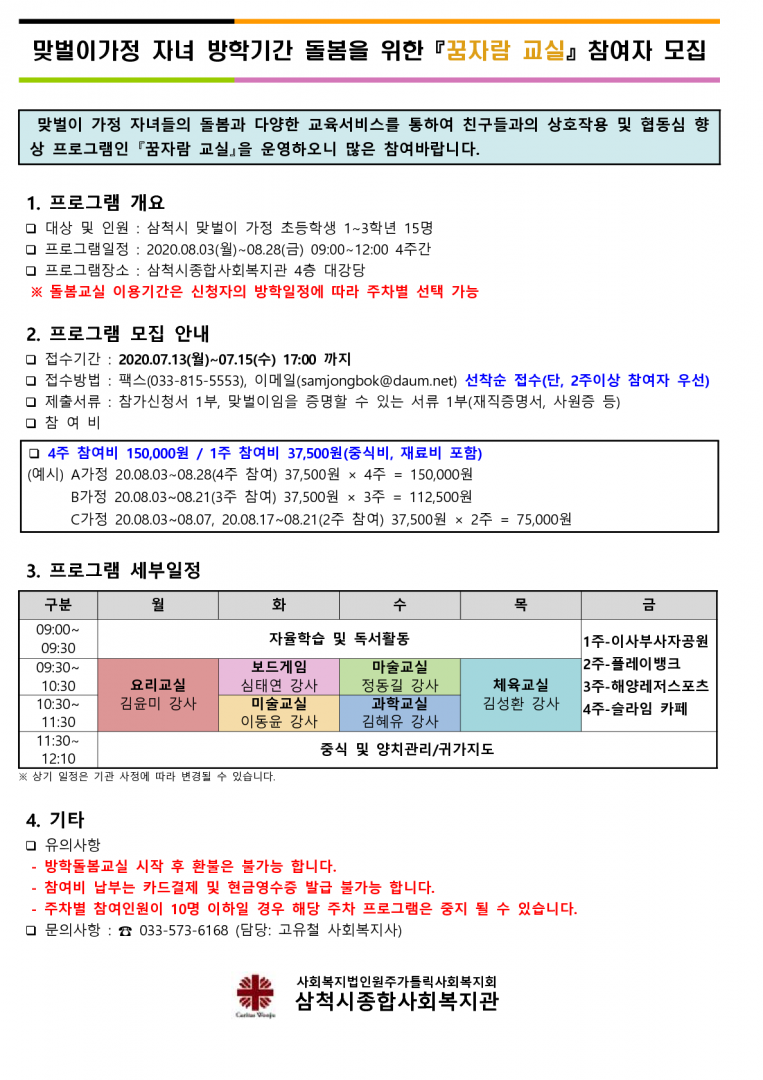 모집공고 2020년 여름방학돌봄교실(꿈자람 교실) 참여자 모집 공고