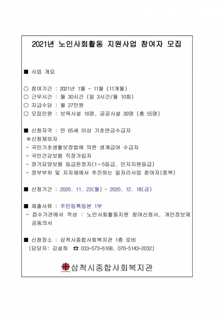 모집공고 2021년 노인사회활동 지원사업 참여자 모집 페이지 정보 작성자 노인일자리담당 댓글 0건 조회 6,318회 작성일 20-11-17 10:47 목록 게시판 리스트 옵션 검색 본문 페이스북 공유 트위터 공유 이전글2021년 삼척시종합사회복지관 프로그램 강사 모집 공고 21.02.05 다음글원덕읍 임원리 카페 바다를바라보다(수로부인) 노인일자리 참여자 모집공고 20.11.05 댓글 0 댓글목록 등록된 댓글이 없습니다.