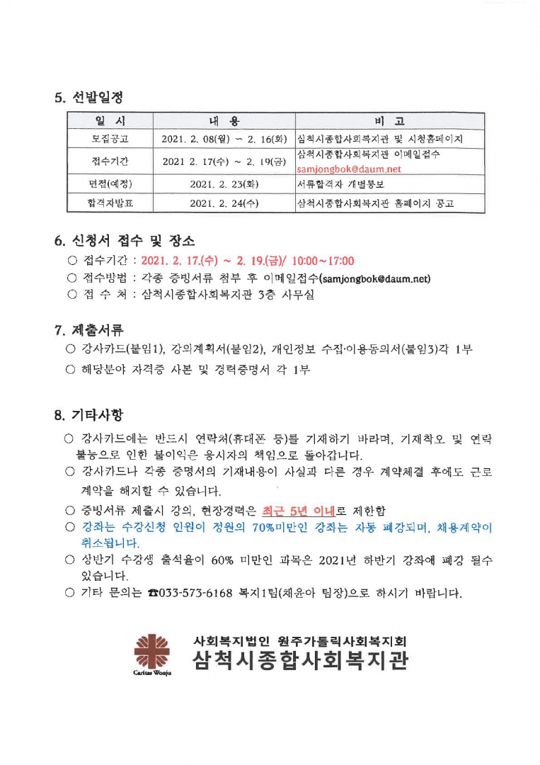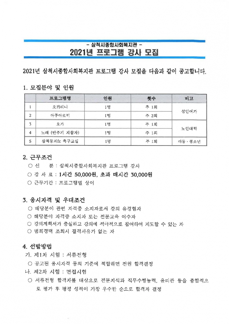 모집공고 2021년 삼척시종합사회복지관 프로그램 강사 모집 공고