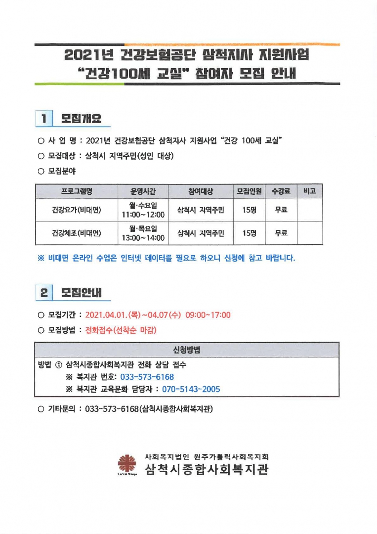 모집공고 2021년 건강보험공단 삼척지사 지원사업 "건강100세 교실" 참여자 모집 안내 페이지 정보 작성자 고유철 댓글 0건 조회 6,316회 작성일 21-03-26 15:25 목록 본문 페이스북 공유 트위터 공유 이전글2021년 종이접기 수료과정 프로그램 참여자 모집 21.03.31 다음글2021년 프로그램 강사 모집(스마트폰활용, 심리정서, 락밴드, 난타) 21.03.17 댓글 0 댓글목록 등록된 댓글이 없습니다.