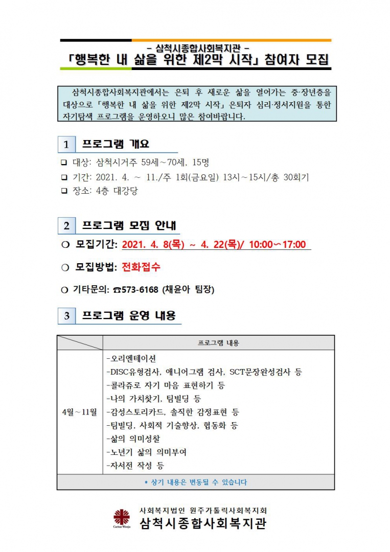 모집공고 행복한 내 삶을 위한 제2막 시작 참여자 모집(은퇴자 심리정서 지원) 페이지 정보 작성자 채윤아 댓글 0건 조회 6,310회 작성일 21-04-08 17:22 목록 본문 페이스북 공유 트위터 공유 이전글삼척노인복지센터(주간보호)이용자 모집 21.04.20 다음글2021년 프로그램 강사채용 공고(독거노인 집단상담. 종이접기) 21.04.08 댓글 0 댓글목록 등록된 댓글이 없습니다.