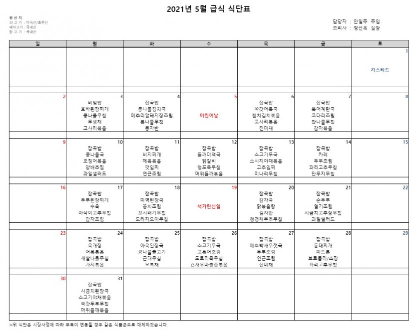 식단표 2021년 5월 식단표 페이지 정보 작성자 안일주 댓글 0건 조회 5,838회 작성일 21-05-03 16:07 목록 게시판 리스트 옵션 검색 본문 페이스북 공유 트위터 공유 이전글2021년 6월 식단표 21.06.01 다음글2021년 4월 식단표 21.04.01 댓글 0 댓글목록 등록된 댓글이 없습니다.