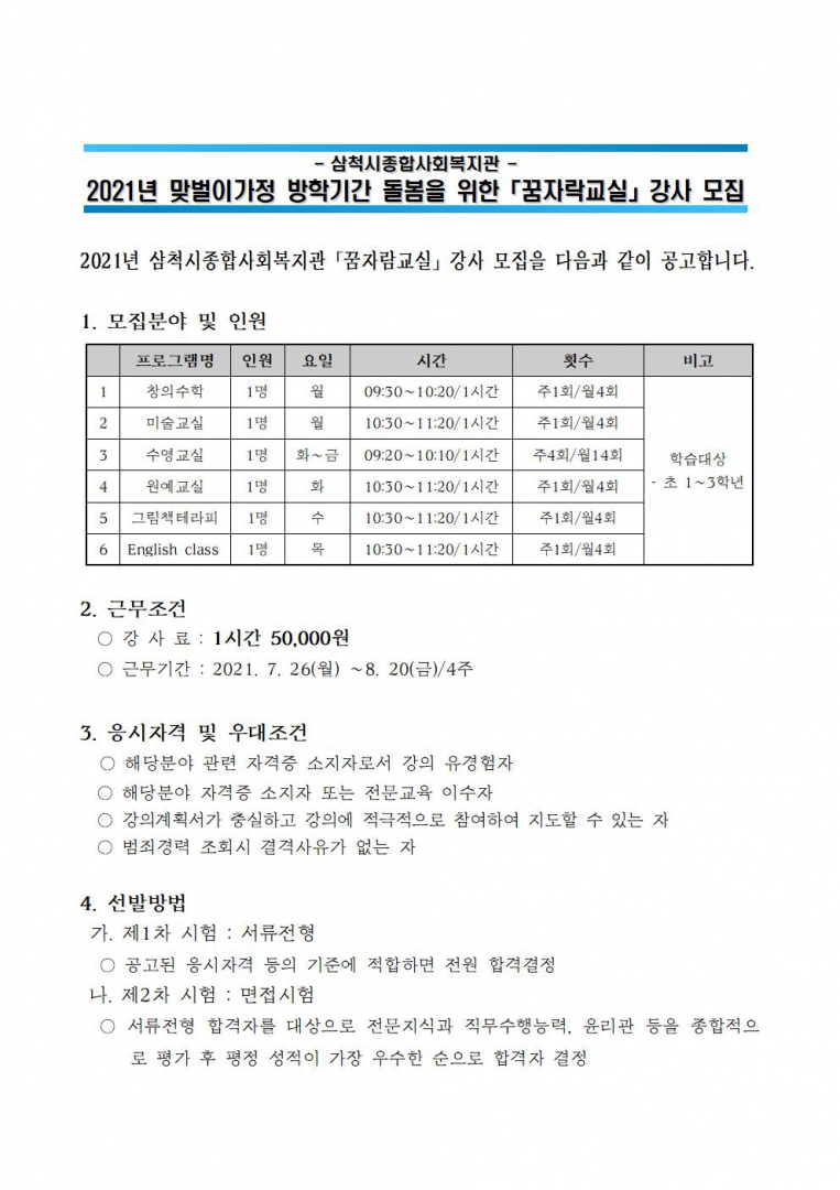 모집공고 2021년 맞벌이가정 방학기간 자녀돌봄을 위한 <꿈자람교실> 강사모집