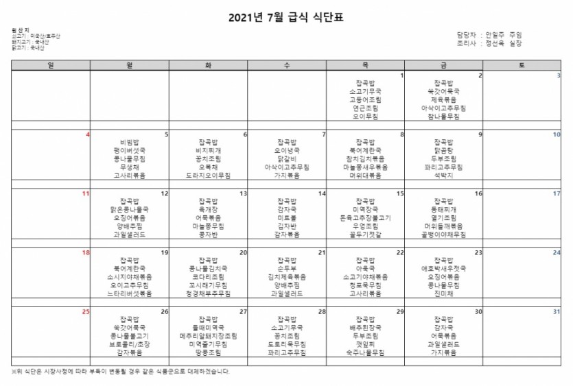 식단표 2021년 7월 식단표 페이지 정보 작성자 안일주 댓글 0건 조회 5,953회 작성일 21-07-01 11:45 목록 게시판 리스트 옵션 검색 본문 페이스북 공유 트위터 공유 이전글2021년 8월 식단표 21.07.30 다음글2021년 6월 식단표 21.06.01 댓글 0 댓글목록 등록된 댓글이 없습니다.