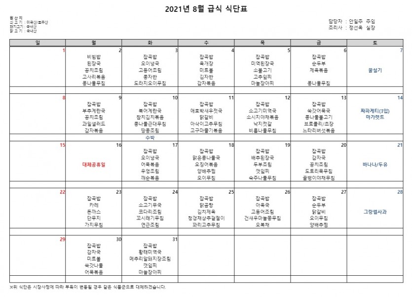 식단표 2021년 8월 식단표 페이지 정보 작성자 안일주 댓글 0건 조회 6,053회 작성일 21-07-30 17:08 목록 본문 페이스북 공유 트위터 공유 이전글지적장애인(경계선 지능) 사회기능 증진을 위한 멘토(자원봉사자)모집 21.11.25 다음글어르신을 낮 동안 보호 해 드립니다. 21.07.14 댓글 0 댓글목록 등록된 댓글이 없습니다.