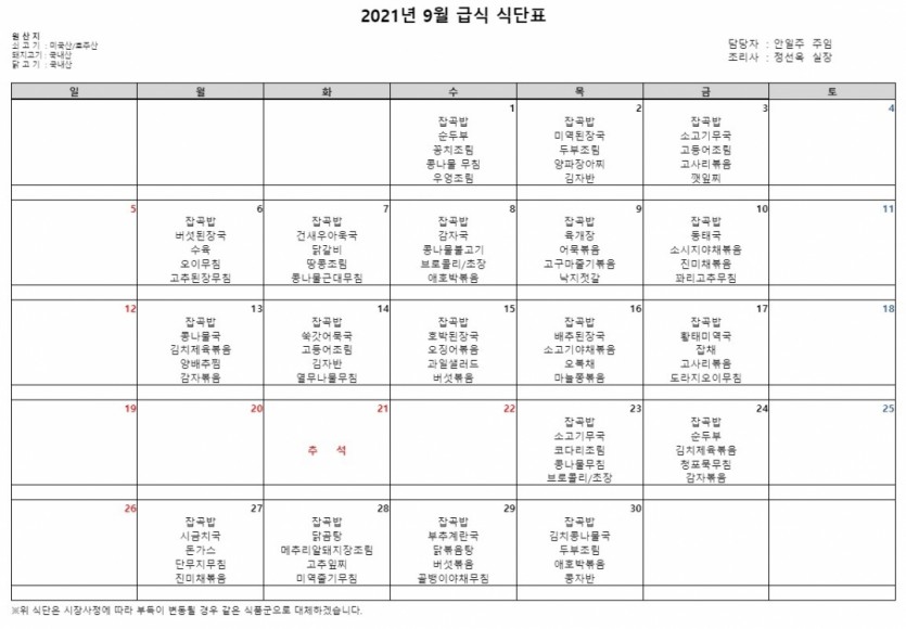 식단표 2021년 9월 식단표 페이지 정보 작성자 안일주 댓글 0건 조회 6,129회 작성일 21-08-31 17:33 목록 게시판 리스트 옵션 검색 본문 페이스북 공유 트위터 공유 이전글2021년 10월 식단표 21.10.01 다음글2021년 8월 식단표 21.07.30 댓글 0 댓글목록 등록된 댓글이 없습니다.