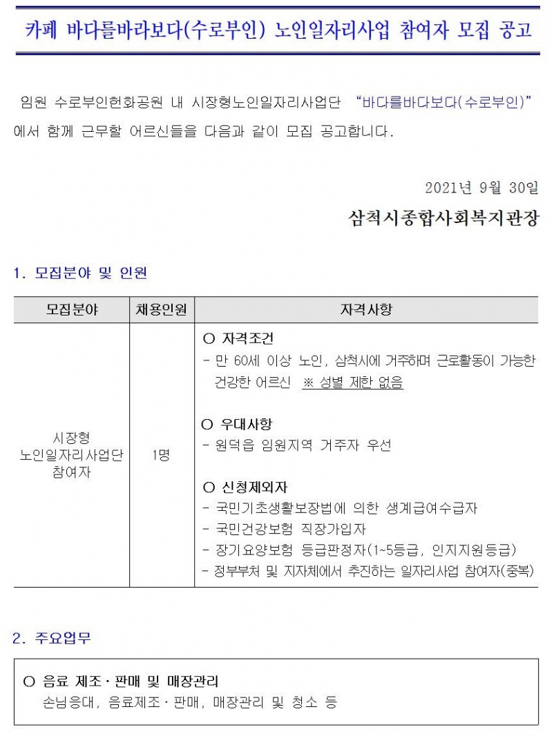 모집공고 바다를바라보다(수로부인)카페 노인일자리 참여자 모집