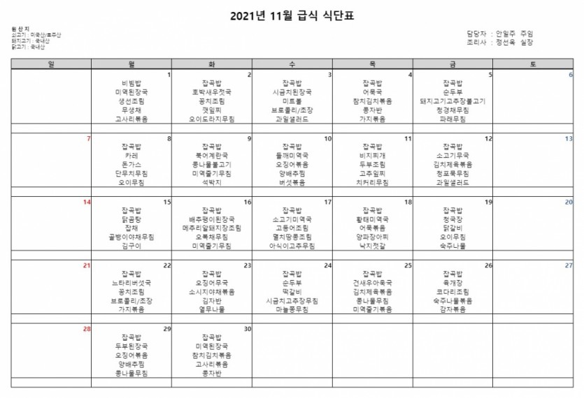 식단표 2021년 11월 식단표 페이지 정보 작성자 안일주 댓글 0건 조회 6,331회 작성일 21-11-01 10:53 목록 게시판 리스트 옵션 검색 본문 페이스북 공유 트위터 공유 ※위 식단은 시장사정에 따라 부득이 변동될 경우 같은 식품군으로 대체하겠습니다. 이전글2021년 12월 식단표 22.09.27 다음글2021년 10월 식단표 21.10.01 댓글 0 댓글목록 등록된 댓글이 없습니다.