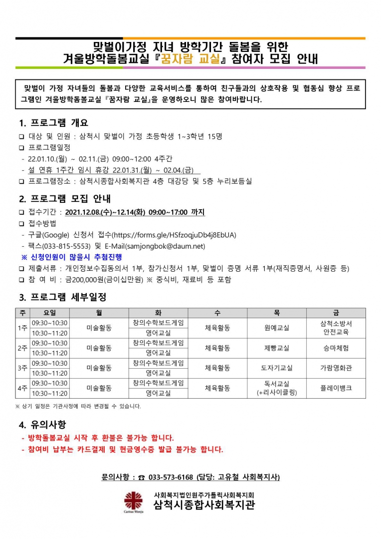 모집공고 맞벌이가정 자녀 방학기간 돌봄을 위한 겨울방학돌봄교실『꿈자람 교실』참여자 모집 안내