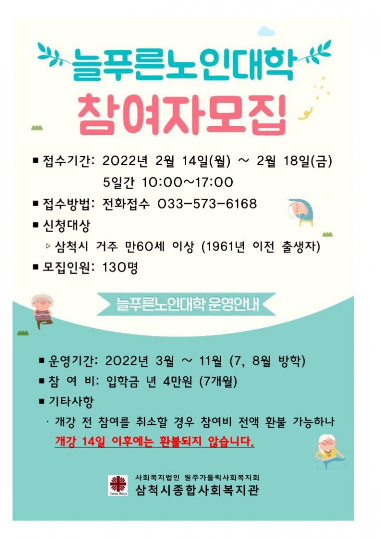 모집공고 2022년 늘푸른 노인대학 참여자 모집 안내 페이지 정보 작성자 김경진 댓글 0건 조회 6,725회 작성일 22-02-10 14:31 목록 본문 페이스북 공유 트위터 공유 이전글2022년 삼척노인복지센터 이용자 모집 22.02.11 다음글2022년 노인대학 및 성인여가 프로그램 강사 모집 22.02.11 댓글 0 댓글목록 등록된 댓글이 없습니다.