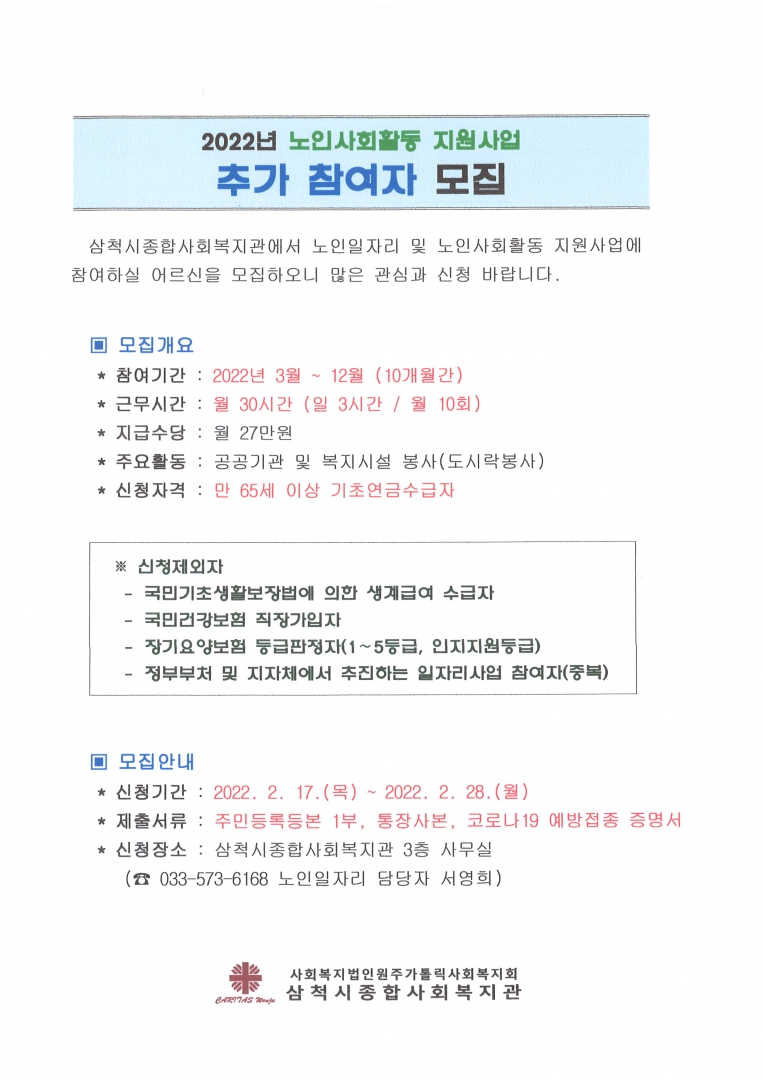 모집공고 2022년 노인일자리 및 노인사회활동지원사업 추가 모집 재공고 페이지 정보 작성자 노인일자리담당자 댓글 0건 조회 6,728회 작성일 22-02-16 13:53 목록 본문 페이스북 공유 트위터 공유 이전글2022년 3월 식단표 22.02.28 다음글수영장 휴장알림 22.02.14 댓글 0 댓글목록 등록된 댓글이 없습니다.