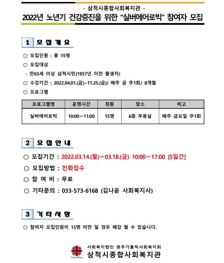 모집공고 2022년 노년기 건강증진을 위한 “실버에어로빅” 참여자 모집 페이지 정보 작성자 김나윤 댓글 0건 조회 6,764회 작성일 22-03-10 12:22 목록 본문 페이스북 공유 트위터 공유 이전글삼척시종합사회복지관 다이어트 댄스 참여자 모집 22.03.16 다음글2022년 3월 식단표 22.02.28 댓글 0 댓글목록 등록된 댓글이 없습니다.