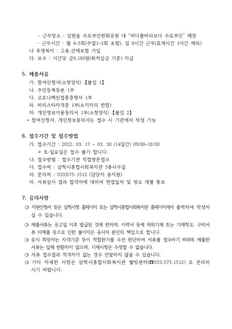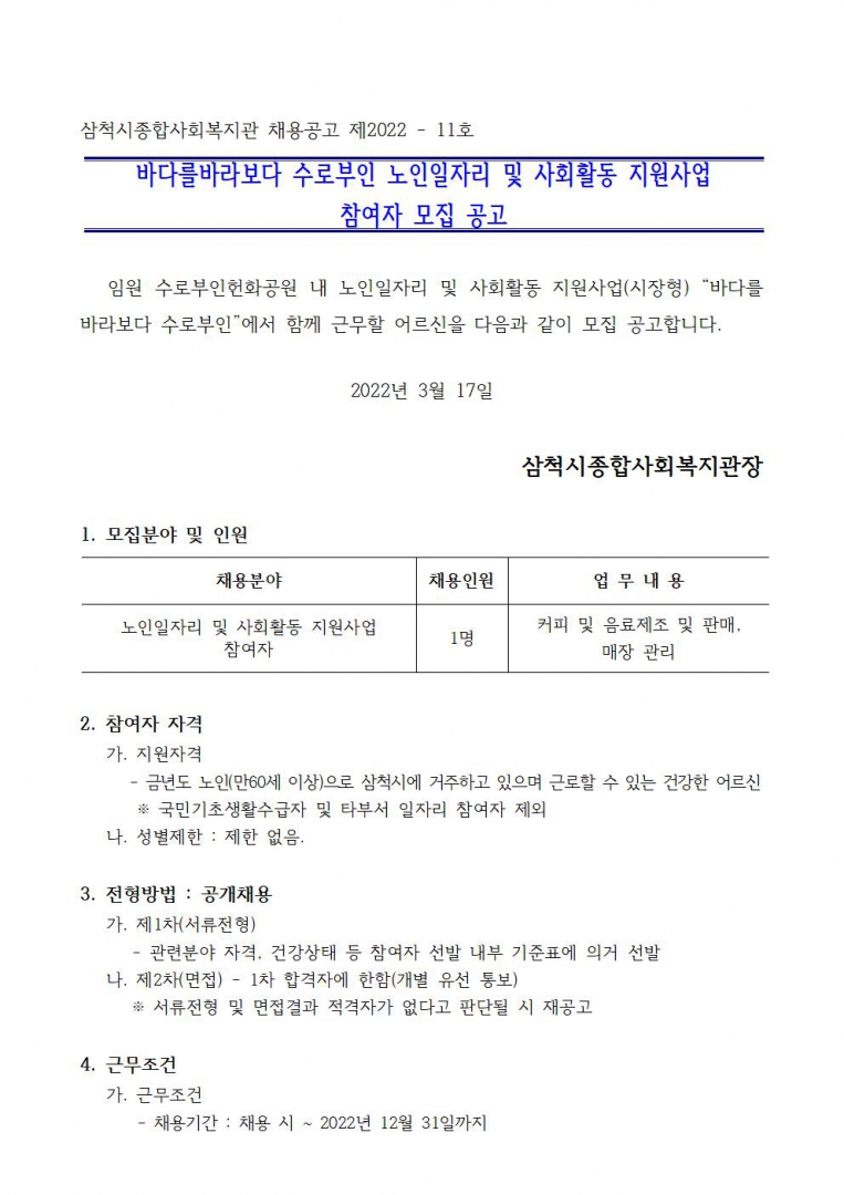 모집공고 2022년 노인일자리 및 사회활동 지원사업(바다를바라보다 수로부인(시장형)) 참여자 모집 공고 페이지 정보 작성자 송지원 댓글 0건 조회 7,020회 작성일 22-03-17 14:27 목록 본문 페이스북 공유 트위터 공유 삼척시종합사회복지관 채용공고 제2022.pdf 이전글2022년 노년기 건강증진을 위한 실버에어로빅 참여자 모집 재공고 22.03.21 다음글삼척시종합사회복지관 다이어트 댄스 참여자 모집 22.03.16 댓글 0 댓글목록 등록된 댓글이 없습니다.