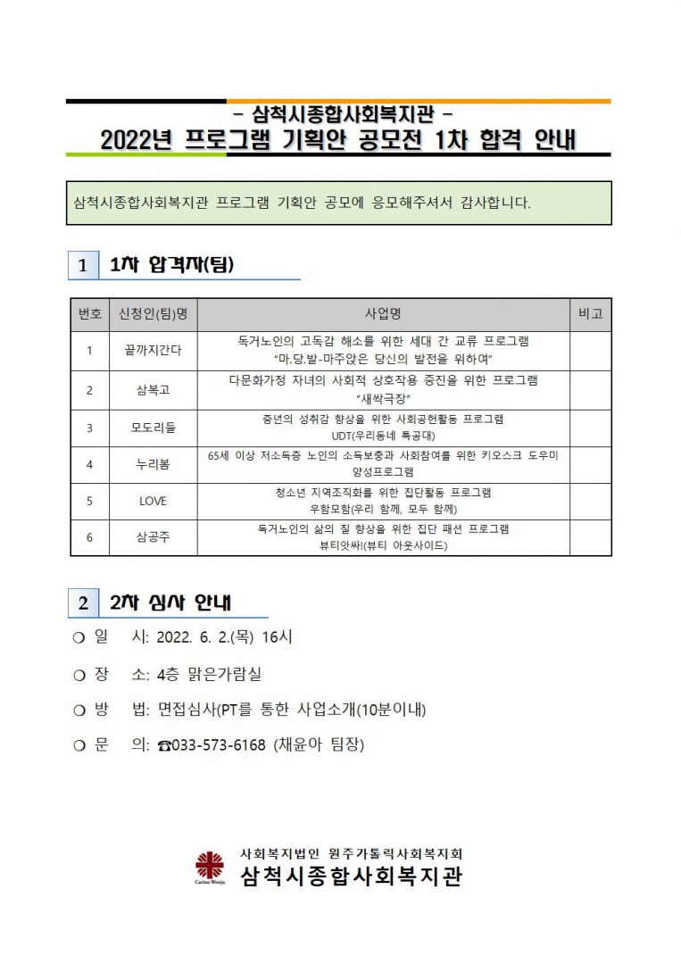 모집공고 2022년 프로그램 기획안 공모전 1차 합격 안내 페이지 정보 작성자 채윤아 댓글 0건 조회 7,422회 작성일 22-05-20 13:19 목록 본문 페이스북 공유 트위터 공유 이전글노인일자리(시장형) 바다를 바라보다 수로부인 참여자 모집공고 22.05.24 다음글2022년 핸드볼과 함께하는 어르신 건강운동 참여자 모집 22.05.13 댓글 0 댓글목록 등록된 댓글이 없습니다.