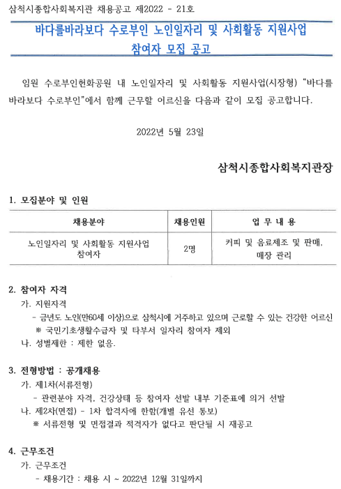 모집공고 노인일자리(시장형) 바다를 바라보다 수로부인 참여자 모집공고 페이지 정보 작성자 송지원 댓글 0건 조회 7,044회 작성일 22-05-24 17:29 목록 본문 페이스북 공유 트위터 공유 이전글2022년 핸드볼과 함께하는 어르신 건강운동 참여자 모집 재공고 22.05.25 다음글2022년 프로그램 기획안 공모전 1차 합격 안내 22.05.20 댓글 0 댓글목록 등록된 댓글이 없습니다.