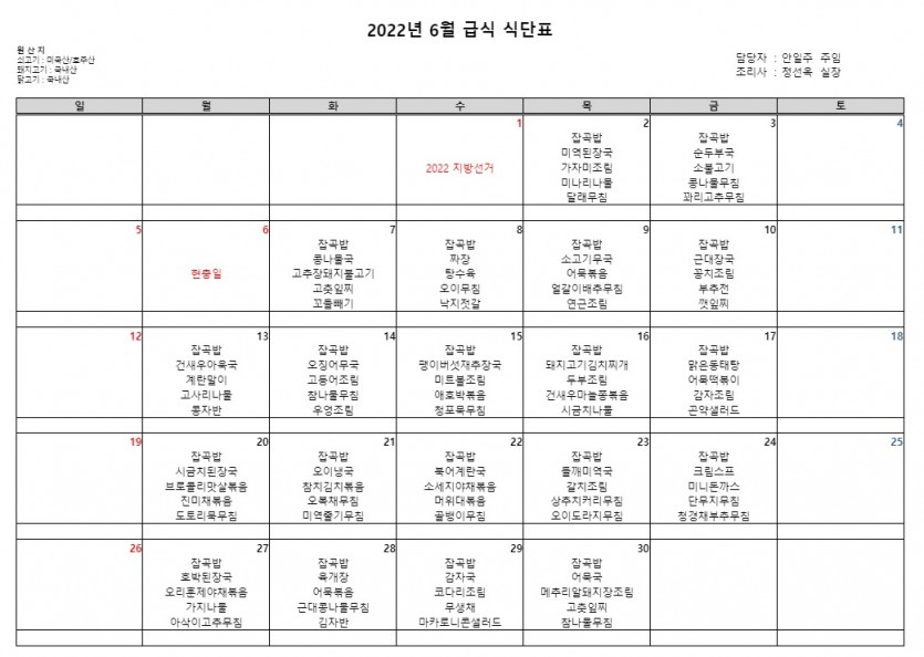 식단표 2022년 6월 식단표 페이지 정보 작성자 안일주 댓글 0건 조회 6,792회 작성일 22-05-31 17:23 목록 게시판 리스트 옵션 검색 본문 페이스북 공유 트위터 공유 ※ 위 식단은 시장사정에 따라 부득이 변동될 경우 같은 식품군으로 대체하겠습니다. 이전글2022년 7월 식단표 22.07.01 다음글2022년 5월 식단표 22.05.23 댓글 0 댓글목록 등록된 댓글이 없습니다.