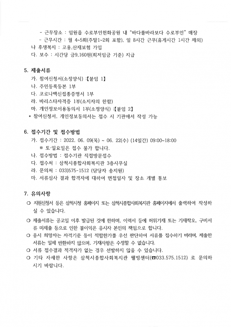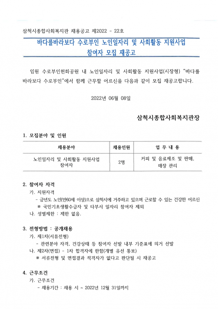 모집공고 노인일자리(시장형) 바다를 바라보다 수로부인 참여자 모집 재공고 페이지 정보 작성자 송지원 댓글 0건 조회 6,903회 작성일 22-06-08 11:43 목록 본문 페이스북 공유 트위터 공유 이전글2022년 프로포절 공모전 최종발표 22.06.09 다음글2022년 6월 식단표 22.05.31 댓글 0 댓글목록 등록된 댓글이 없습니다.