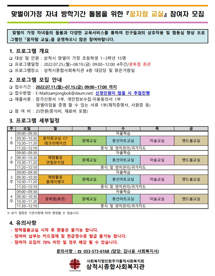 모집공고 맞벌이가정 자녀 방학기간 돌봄을 위한 꿈자람교실 참여자 모집