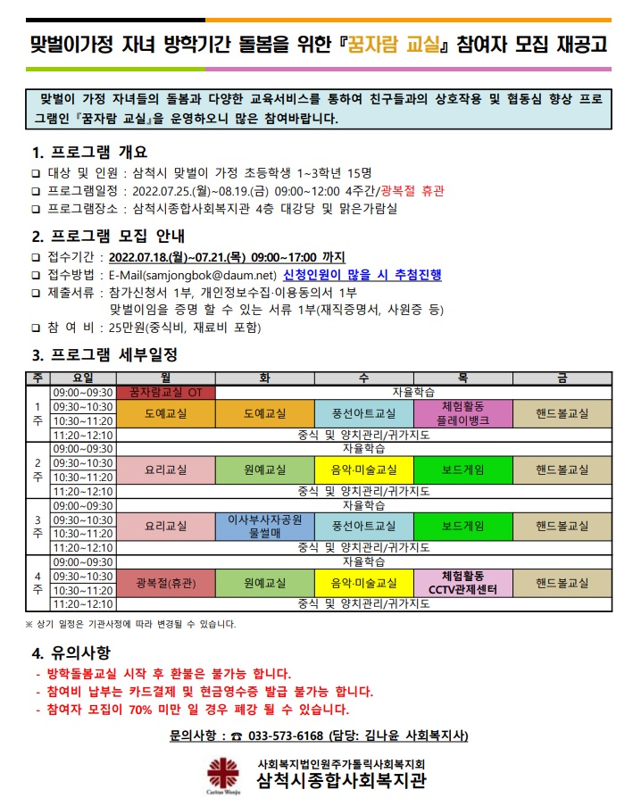 모집공고 맞벌이가정 자녀 방학기간 돌봄을 위한 꿈자람교실 참여자 모집 재공고