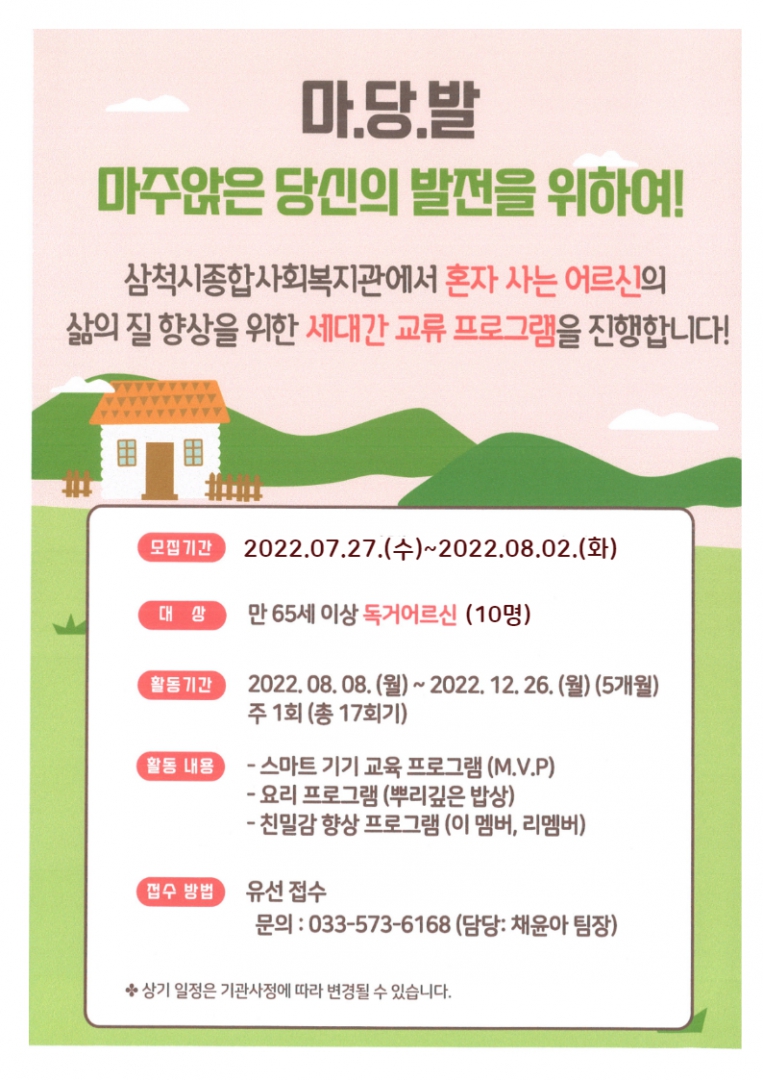 모집공고 독거어르신의 삶의 활력증진을 위한 세대 간 교류 "마당발(마주앉은 당신의 발전을 위하여)"…