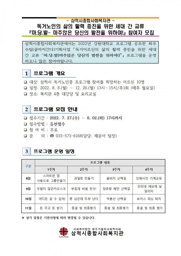 삼척시종합사회복지관에서는 2022년 강원대학교 프로그램 공모전 최우수팀(끝까지간다) 기획사업