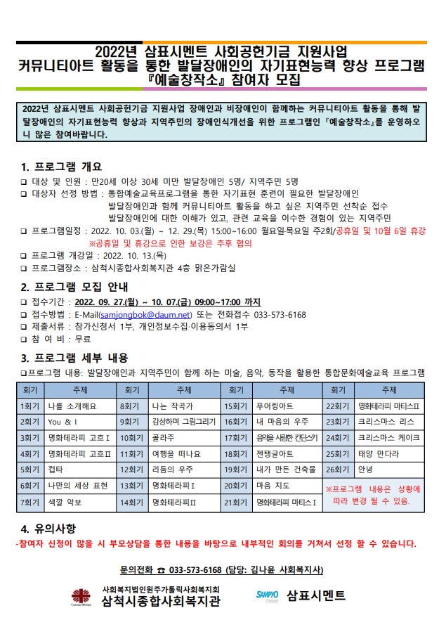 모집공고 2022년 삼표시멘트 사회공헌기금 지원사업 커뮤니티아트 활동을 통한 발달장애인의 자기표현능력 향상 프로그램 『예술창작소』참여…