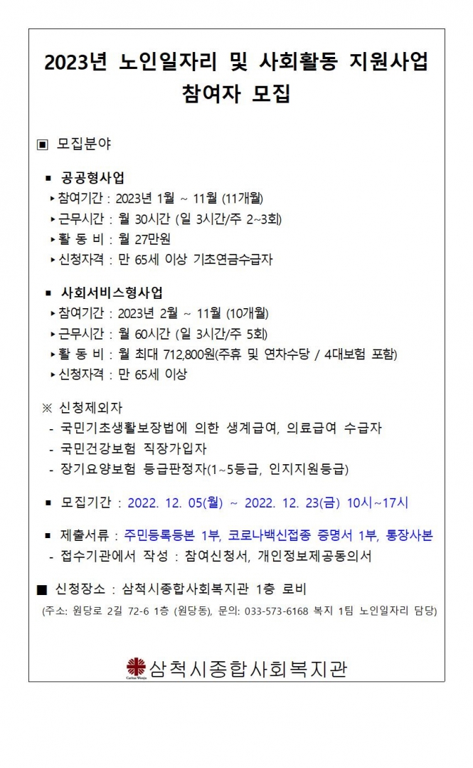 모집공고 2023년 노인일자리 및 사회활동 지원사업 참여자 모집 페이지 정보 작성자 김규범 댓글 0건 조회 7,962회 작성일 22-12-02 13:52 목록 본문 페이스북 공유 트위터 공유 이전글2023년 체력증진교실 겨울특강 참여자 모집 22.12.15 다음글2022년 12월 식단표 22.12.01 댓글 0 댓글목록 등록된 댓글이 없습니다.