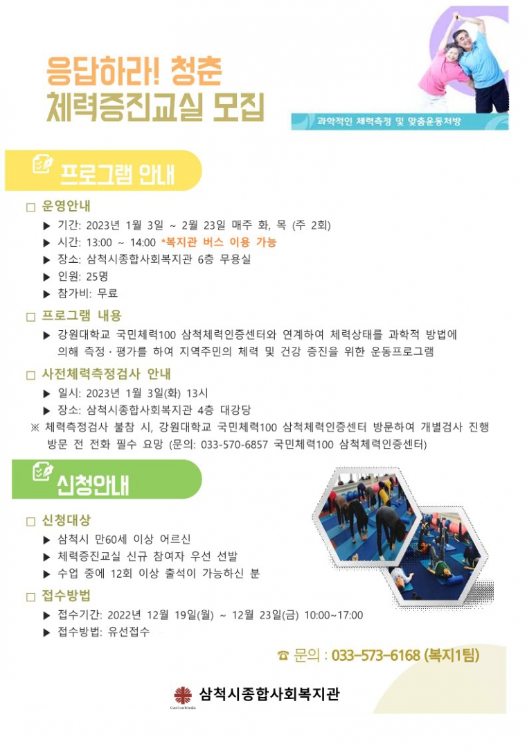 모집공고 2023년 체력증진교실 겨울특강 참여자 모집 페이지 정보 작성자 김경진 댓글 0건 조회 8,023회 작성일 22-12-15 11:27 목록 본문 페이스북 공유 트위터 공유 이전글삼척시종합사회복지관 웰빙센터 수영강습 접수안내 23.05.31 다음글2023년 노인일자리 및 사회활동 지원사업 참여자 모집 22.12.02 댓글 0 댓글목록 등록된 댓글이 없습니다.