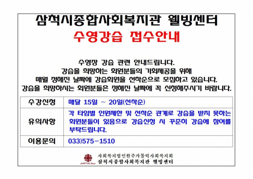 공지사항 삼척시종합사회복지관 웰빙센터 수영강습 접수안내 페이지 정보 작성자 심성규 댓글 0건 조회 8,708회 작성일 23-05-31 14:12 목록 본문 페이스북 공유 트위터 공유 이전글2022년 후원자 및 자원봉사자 감사의 날 행사 안내 22.12.27 다음글2023년 체력증진교실 겨울특강 참여자 모집 22.12.15 댓글 0 댓글목록 등록된 댓글이 없습니다.