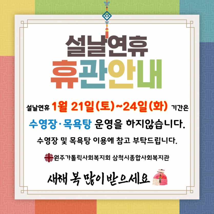 공지사항 2023년 설날 연휴 웰빙센터(수영장·목욕탕) 휴관 안내 페이지 정보 작성자 천하영 댓글 0건 조회 11,007회 작성일 23-01-09 18:19 목록 게시판 리스트 옵션 검색 본문 페이스북 공유 트위터 공유 이전글2023년 겨울방학 어린이특강반 추가모집 안내 23.01.17 다음글2023년 삼척시도계보금자리 본예산(안) 공고 23.01.09 댓글 0 댓글목록 등록된 댓글이 없습니다.