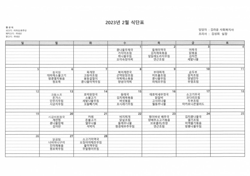 식단표 2023년 2월 식단표 페이지 정보 작성자 안일주 댓글 0건 조회 7,539회 작성일 23-02-01 11:50 목록 게시판 리스트 옵션 검색 본문 페이스북 공유 트위터 공유 이전글2023년 3월 식단표 23.03.02 다음글2023년 1월 식단표 23.01.02 댓글 0 댓글목록 등록된 댓글이 없습니다.