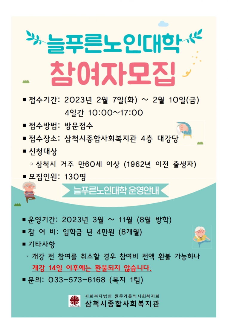 모집공고 2023년 늘푸른노인대학 참여자 모집 공고 페이지 정보 작성자 김재영 댓글 0건 조회 7,943회 작성일 23-02-01 17:16 목록 게시판 리스트 옵션 검색 본문 페이스북 공유 트위터 공유 이전글2023년 실버아쿠아로빅 참여자 모집 23.02.10 다음글2023년 체력증진교실 겨울특강 참여자 모집 22.12.15 댓글 0 댓글목록 등록된 댓글이 없습니다.