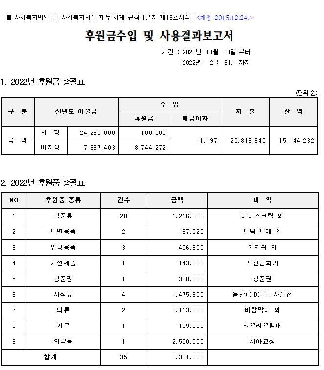 「사회복지법인 및 사회복지시설 재무회계규칙 제41조 제6항」에 의거하여, 2022년 삼척시도계보금자리 후원금 수입 및 사용