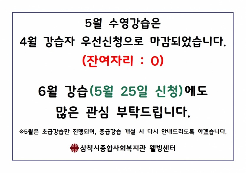 공지사항 5월 수영강습 신청 잔여자리 안내 페이지 정보 작성자 천하영 댓글 0건 조회 8,542회 작성일 23-04-24 12:02 목록 본문 페이스북 공유 트위터 공유 이전글5월 수영강습 일정 변경 안내 23.04.28 다음글2023년 웰빙센터 수영장 수강신청 안내 23.05.31 댓글 0 댓글목록 등록된 댓글이 없습니다.