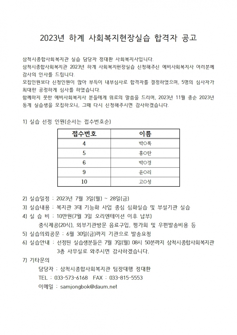 공지사항 2023년 하계 사회복지현장실습 합격자 공고 페이지 정보 작성자 정대환 댓글 0건 조회 11,365회 작성일 23-06-14 13:45 목록 본문 페이스북 공유 트위터 공유 이전글2023년 강원도노인복지증진사업 "손끝에서 만들어가는 행복" 프로그램 참여자 추가 모집 23.06.29 다음글2023년 하계 사회복지현장실습생모집(6월 12일까지) 23.06.02 댓글 0 댓글목록 등록된 댓글이 없습니다.