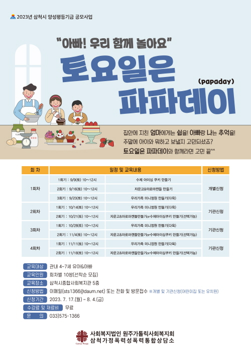 ○ 신청방법: 이메일(sts1366@daum.net) 또는 전화 및 방문접수(삼척시종합사회복지관 5층 삼척가정 폭력성폭력통합상담소) ※개별 및 기관(어린이집 및 유치원) 신청